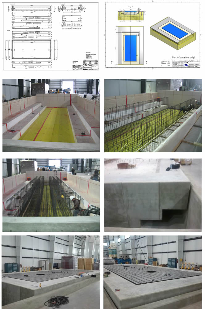 Foundations for testing applications are made of concrete and steel. Masses of approx. 20 to 2 000 tons can be achieved. Heavy foundations on soft underground require additional pile foundations..