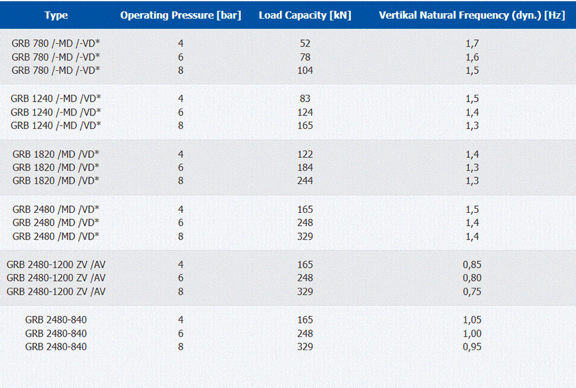 A rolling rubber bellow is positioned between a load plate on top and the piston below. The rolling rubber is made of a high quality elastomer with vulcanized reinforced steel belts. Cover plate and piston are made from cast aluminum. The sealing surfaces are machined. All other surfaces are blasted. Due to this concept very low vertical and lateral stiffness is realized in order to get much more lower natural frequencies in comparison to other air types.