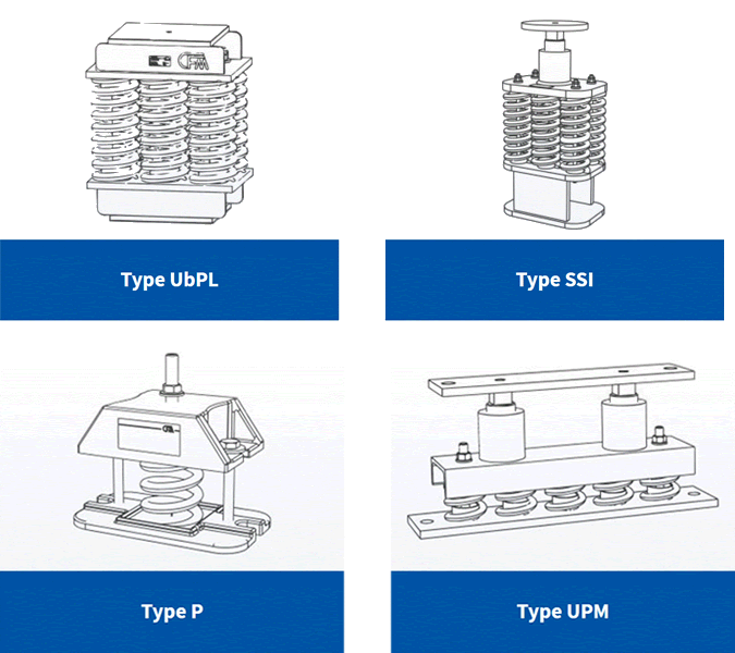 CFM Schiller produces steel spring isolators with or without integrated viscous damping. They are primarily applied for supports of plants and machines that have an excitation frequency above approx. 3 Hz or that emit impulse excitations. The viscous damper plays a key role in the successful vibration isolation. The natural frequencies of our steel spring isolators range from 1.5 Hz to 6.1 Hz, depending on the type. In addition to the standard types, CFM Schiller also designs and manufactures isolators and dampers that specifically suit your application. These special designs can include isolators and dampers made from corrosion-resistant materials. Our in-house TÜV-certified testing laboratory enables us at CFM Schiller to verify the quality of our produced products and to perform fatigue tests on them. CFM Schiller produces steel spring isolators in 4 standard types, which are all quickly shippable. By applying highly automated production processes, we are able to offer products of high quality with an optimal price-performance ratio. |